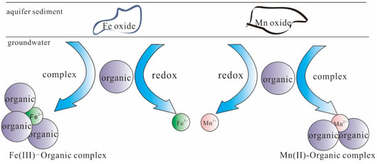 Numerous investigations have focused on Fe and Mn pollution in groundwater, especially that for drinking, worldwide, such as in China [19], USA [20,21], European countries [3], and India [22]. These studies have revealed the primary geochemical processes involved in the genesis of Fe- and Mn-rich groundwater [23]. The mechanism that causes the release and mobilization of Fe and Mn from aquifer sediments into groundwater in the natural environment is primarily the redox dissolution of Fe- and Mn-bearing minerals [8], such as magnetite, hematite, limonite, siderite, pyrite, manganite, braunite, pyrolusite, and psilomelane [24], sometimes with an impact on the desorption from sediment surface via competition with some other cations. Although Fe and Mn in groundwater are mainly introduced from the natural environment [25], they are also suspected of being influenced by anthropogenic activities [26]. With the socio-economic development, the impact of anthropogenic activities on groundwater has reached an unprecedented level in recent years [27]. The impact not only causes different degrees of pollution to groundwater by direct discharge of pollutants [28], but also changes the environmental conditions of groundwater (e.g., acid–base properties, redox conditions, pH, and microbiome) [29,30], both of which have been considered to have an impact on the natural environmental processes of Fe and Mn [31]. Organic matter is on the list of the anthropogenic pollutants [32]. The superposition of these anthropogenic pollutants and the chemical components in the natural environment make the hydrogeochemical process more complicated [33]. It has been found that the concentrations of Fe and Mn in groundwater with higher concentrations of organics are usually higher than those in groundwater without pollution of organics or with lower pollution degree [34]. For example, on the regional scale, such as in the important aquifers in USA [35], China [36], and some other counties [37,38], it has been found that the concentrations of Fe and Mn have increased in the past decades, simultaneously with the increased imports of organics (usually characterized by DOC, COD, or BOD), the anoxic and the acid environment. Simultaneously, on the site scale, such as in waste landfills [36] and polluted sites [39,40], it has also been found that the concentrations of Fe and Mn in the surrounding groundwater considerably increased after the operation of those sites for a period of time, while the background values of them in the groundwater were not high, and they were not discharged by those sites [41,42]. However, it should be noted that there were various organics, nitrogen species, or acid–base substances in the main pollutants of these sites [43]. Thus, it is an issue worthy of discussion, whether the positive correlation between Fe and Mn in groundwater and those pollutants introduced by anthropogenic activities is a coincidence or an inevitability in the physicochemical mechanism.
