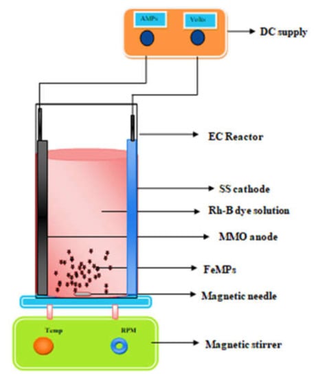 The 250 mL of undivided polyacrylic electrochemical with measurements of 7 cm × 6.5 cm × 13 cm were used to conduct experiments. Commercially available mixed-metal-oxide (TiO2, IrO2, RuO2)-coated titanium plate was employed as anode and a stainless steel plate was employed as cathode. Both the electrodes were of the same size of 5 cm × 5 cm and placed vertical and parallel to one another at 6 cm apart in a bench-scale batch process, as shown in Figure 2. Rhodamine-B dye solution with concentration of 100 mg/L was prepared using distilled water. Prepared synthetic dye was transferred into the reactor. The anode and cathode were connected to the respective nodes of the DC current meter. Current was applied using DC power supply having a range of 0–2 A and 0–32 V. A magnetic stirrer was used to keep the solution well mixed. During the 3D electrochemical process, 1 gm/L of Fe-MP was added in dried powder form in the reactor containing 250 mL of 100 mg/L of Rh-B dye. The solution was aerated at the rate of 2 LPM and mixing was provided at 500 RPM. The 3D EO process occurred in the presence of 0.1 M Na2SO4 electrolyte, 10mA/cm2 current density, 25 °C temperature, and pH 4 (solution pH). To verify whether decolorization was achieved due to the in situ generation of hydroxyl radicals, experiments were carried out by adding radical scavengers as 2.4 mM of DMSO for hydroxyl radicals in 2D and 3D electrode reactors.