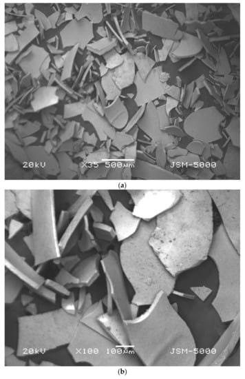Characterization of the iron microparticles was done by SEM analysis to verify the morphology, shape, and size of synthesized particles, and EDS evaluation was carried out to study the functional groups of the microparticles []. The samples were observed by scanning electron microscopy, SEM (Jeol JSM 500F, Tokyo, Japan). Initially, the powdered samples were attached onto adhesive tapes reinforced on metallic disks and then secured with a thin, electric conductive gold film. Micrographs of samples were produced at two different resolution of Figure 3a 500 µm and Figure 3b 100 µm at voltage of 20 kV. Iron microparticles were found to be of average diameter of about 100 µm. The shape of the particles is irregular because of the agglomeration and drying process.