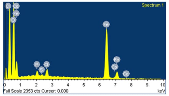 EDS is performed to evaluate the content of every single component in the sample of synthesized iron particles. Figure 4 shows EDS analysis of synthesized iron particles. The image clearly demonstrated strong peaks for iron atoms. The high signal peaks were observed at 0.7 KeV and between 6 KeV and 7 KeV near to 6.3 KeV as a result of absorption of iron crystals, which reveals the presence of iron microparticles. EDS spectrum recorded high peaks for 47.77% iron and 47.34% oxygen, which suggest that iron is in oxide form. Various peaks of other elements are reported such as 2.31% chlorine, 1.74% phosphate, 0.42% sulfur, and 0.42% cobalt. These compounds from plant extract are also present on the surface of Fe-MPs.