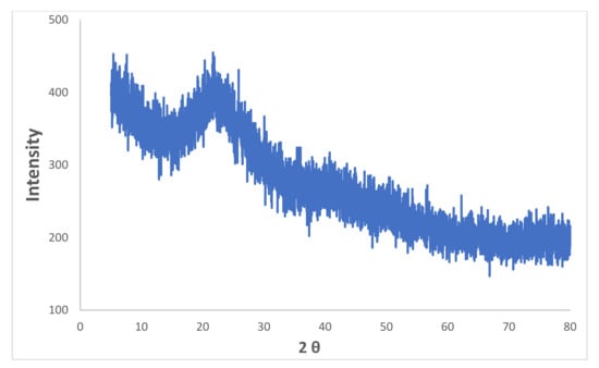 X-ray diffraction (XRD) spectroscopy was performed using X-ray diffraction (XRD)-PANalytical equipped with a Cu-anode to the phase and crystalline nature of prepared iron microparticles. The pattern obtained, as shown in Figure 5, is lacking distinctive diffraction peaks, which suggests that the structure of iron microparticles is amorphous. The results are in agreement with the other previously reported studies [,]. A broad peak observed at around 2θ of 15−25° is possibly due to organic materials present in green tea extract that play a role of capping agent during the synthesis of iron microparticles.
