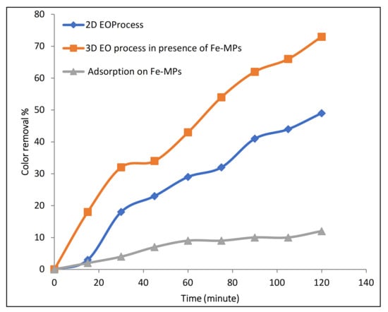 During our previous studies, 2D electrochemical oxidation results showed lower removal efficiency while using Na2SO4 as electrolyte []. Hence, to improve the efficiency of electrochemical oxidation with Na2SO4, synthesized Fe microparticles were used as a three-dimensional particle electrode/catalyst in this study. Figure 6 indicates that, in the presence of Na2SO4, in the 2D EO process, 49% color removal was observed in 120 min of reaction time. On the other hand, during the 3D EO treatment, 73% color removal was observed in the same period of 120 min of electrolysis time. This clearly shows that the addition of Fe-MP as third electrode has a catalytic effect on the electro-oxidation process. For the investigation of adsorption on Fe-MPs, the solution of 100 ppm Rh-B with 1 g/L dose of Fe-MPs was continuously stirred at 500 RPM for two hours. The samples were taken at predetermined time intervals, centrifuged, and analyzed by UV-spectroscopy. A result of UV-spectrophotometers revealed that only 12% adsorption of Rh-B dye occurs on Fe-MPs in 120 min.