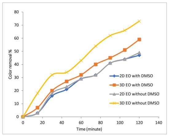 To detect whether formation of free radicals increased with the use of Fe-MPs, radical scavenger DMSO was used. Affinity of DMSO towards hydroxyl radical is higher than dye molecules, thus DMSO associates with hydroxyl radical and methane sulfinic acid to form methyl radical. Detection of hydroxyl radicals was carried out using 2.4 mM of DMSO in 100 mg/L of Rh-B dye with 0.1 M of Na2SO4 at 10 mA/cm2 with initial temperature of 25 °C, 500 RPM and at pH 4 in 2D, and during the 3D EO process, 2 LPM air flow with 1 g/L of Fe-MP were added. DMSO was used for scavenging hydroxyl radicals, and therefore, reduction in the rate of decolorization should occur if hydroxyl radicals are present. During 2D EO, slight reduction in decolorization efficiency was observed, as shown in Figure 7, indicating the presence of hydroxyl radicals in small quantity, because during the 2D EO process in the presence of Na2SO4, degradation of pollutant mainly occurs due to direct oxidation at the anode; detection or formation of hydroxyl radicals in large quantity did not take place. During 3D EO, a major reduction in decolorization process was observed after the addition of DMSO, indicating that a higher amount of hydroxyl radicals was produced in the 3D EO process. As the Fe-MPs showed catalytic effect during the 3D electro-oxidation process, further investigation has been done to analyze the effect of pH and Fe-MPs dose on the process.