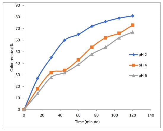 Experiments were conducted using 100 mg/L Rh-B dye along with 1 gm/L Fe-MP dose, 3.55 g/L (0.1 M) of Na2SO4 at 10 mA/cm2 with initial temperature of 25 °C and 500 RPM, 2 LPM air flow with varying pH (2, 4 and 6). Results in Figure 8 show that pH produced the significant effects on the efficiency of color removal. At pH above 4, decomposition rate decreases, because the oxidation potential of hydroxyl (OH•) radicals and dissolved portion of iron species decreases when pH increases. Optimum pH range for electro-Fenton reaction is also 2 to 4. At lower pH value, hydrogen peroxide is converted to H3O2 that is more stable and also reduces its reactivity with ferrous ions, which reduces production of hydroxyl (OH•) radicals.