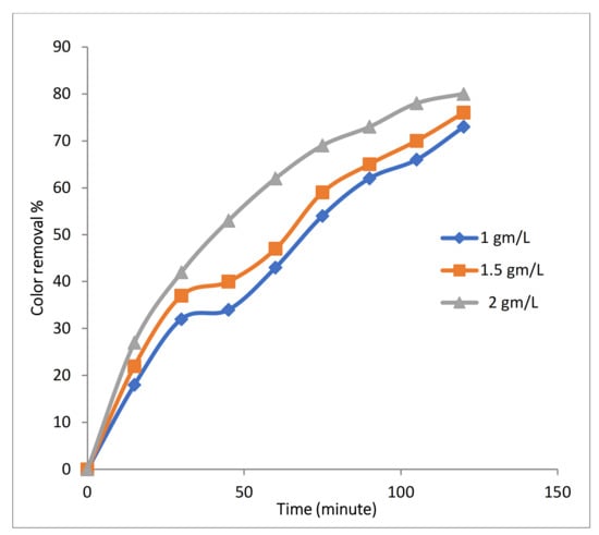 Experiments were conducted with 100 mg/L of Rh-B dye along with 3.55 g/L (0.1 M) of Na2SO4 at 10 mA/cm2 with initial temperature of 25 °C and 500 RPM, 2 LPM air flow at pH 4 with varying Fe-MP dose, (1, 1.5, and 2 g/L). Figure 9 clearly shows that with increases in dose of Fe-MPs, color removal efficiency and decolorization rate increased. This is because of obvious reasons that the concentration of Fe2+ ion and numbers of microelectrodes increases with an increase in dose of Fe-MPs, which leads to a higher decolorization rate and color removal efficiency.