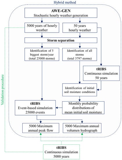 - The proposed hybrid method reduces the time computation of continuous simulations from 49 days (5000 years, hourly time step, high performance computer) to 27 h of computation (standard computer) for Peacheater Creek basin (64 km2), 18 h to carry out the continuous simulation of 50 years and 9 h to perform the event-based simulations (25,000 events).