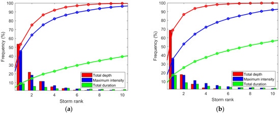 - The higher return period of the events analyzed, the lower storm ranks are needed (number of biggest storm per year considered, total depth criteria) to ensure the inclusion, either the maximum annual peak-flow and/or the maximum annual hydrograph volume.