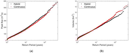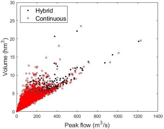 - The hybrid method reproduces the univariate flood frequency curves with a good agreement to those obtained by the continuous simulation. The maximum annual peak-flow frequency curve is obtained with a Nash–Sutcliffe coefficient of 0.98, whereas the maximum annual volume frequency curve is obtained with a Nash–Sutcliffe value of 0.97.