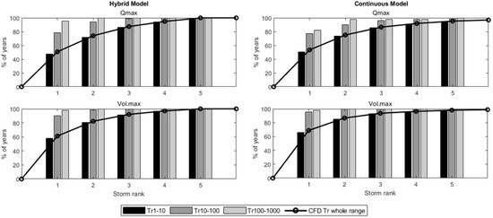 - The correlation between the occurrence of maximum annual peak-flows and volumes is preserved by the hybrid method similarly to the continuous modelling approach. An error lower than 6 % was estimated (hybrid method and Storm Rank 5) compared to the results obtained through continuous modelling.