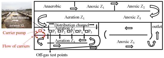 The study was conducted in aerobic tank Z2 (Figure 1). The working volume of the tank was 3757 m3, and the CFR of the tank was 46%. The off-gas test was performed at the selected five points (P1–P5; Figure 1), and the spacing between the test points was 8 m. As shown in Figure 1, the wastewater comes from the Aeration Z1, then goes through the water distribution channel, and the water distribution channel distributes the wastewater (the dotted line in Figure 1). The wastewater goes through from Aeration Z2 to Aeration Z3. The carriers were pumped from Aeration Z2 to Aeration Z3 or from Aeration Z3 to Aeration Z2 by a carrier pump (200 m3/h, ZhongKai, Hebei, China). The CFR of the Aeration Z2 was controlled from 7.7% to 57.7%). The running time of the pump was 14 h (from 17:00 to 7:00 the next day). The valve openings of the coarse-bubble aeration systems and fine-bubble aeration systems were 50% and 100%, respectively. The coarse-bubble aeration systems and the fine-bubble aeration systems worked the hybrid aeration systems simultaneously, with the valve openings of the two aeration systems being 50%.