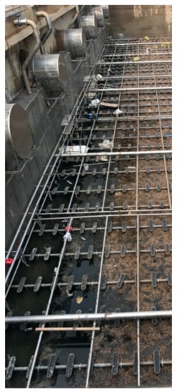 The WWTP was located in Qingdao, China, and consisted of influent screening, primary clarifiers, conventional plug flow activated sludge and IFAS process, secondary clarifiers, effluent cloth filters, and disinfection. The treatment capacity of the WWTP was 250,000 m3/d, and the effluent met the standard A of GB18918-2002 of China. The operating conditions of the WWTP during testing are shown in Table 1. The tank geometry and off-gas test points are shown in Figure 1. The study was conducted in aerobic tank Z2 (L × W × D = 47 m × 8 m × 6 m), and the full-scale IFAS reactor (L × W × D = 47 m × 8 m × 6 m) was equipped with the carriers (Spring Water-Treatment, Ltd., Qingdao, China) with a specific surface area of 500 m2/m3 and a density of 0.96 g/m3. As shown in Figure 2, the coarse-bubble (stainless steel with an orifice size of 5 mm) aeration systems and the fine-bubble (Supratec, OXYFLEX® MF650, Shanghai, China) aeration systems constituted the aeration systems of the IFAS process. The tank was fully covered with the two kinds of aeration systems. The fine-bubble aeration systems were installed 0.5 m above the ground, and the coarse-bubble aeration systems were installed 0.7 m above the ground. The fine-bubble aeration systems and the coarse-bubble aeration systems can work alone or work simultaneously (called hybrid aeration systems). The airflow rates of the coarse-bubble, the fine-bubble, and the hybrid aeration systems during the experiments were 1783 m3/h, 1351 m3/h, and 2262 m3/h, respectively.