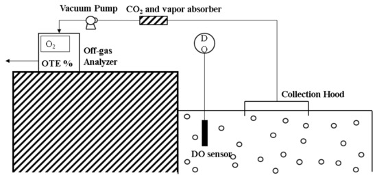 The αOTE reflects the actual oxygen transfer capacity, and the αSOTE can be used to compare the oxygenation capacity of different aeration systems. The off-gas tests were conducted under process conditions according to Appendix E of The American Society of Civil Engineers (ASCE) (2018). The schematic diagram of the off-gas method is shown in Figure 3. The dissolved oxygen (DO) was measured with an optical LDO sensor (Hach-Lange, Berlin, Germany). The DO sensor was submerged in the water and beside the collection hood. The electrical conductivity was measured with a 3798-S sensor (Hach-Lange, Berlin, Germany). The off-gas was captured by a hood and diverted to an X-STREAM gas analyzer (Emerson Electric Company, St. Louis, USA). The mole ratio of O2 was measured in the ambient air (MRi) and off-gas (MRe), which was recorded every minute during the tests, and water vapor and CO2 were removed before the off-gas analysis. Appendix E of ASCE (2018) recommended 6–13 mins for each test, and each test should have taken no less than 4 h in this experiment. The αOTE and the αSOTE were calculated as Formulas (1) and (2):