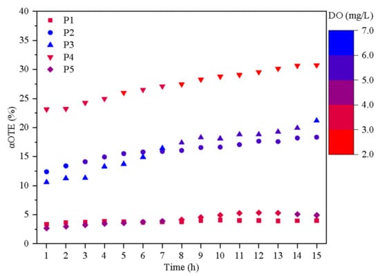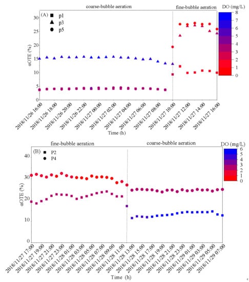 As shown in Figure 4, the vertical axis stands for the αOTE, and the color scale stands for the DO concentration. The αOTE of the fine-bubble aeration systems was greater than that of the coarse-bubble aeration system. However, the DO showed the opposite pattern. After altering the aeration type (change the coarse-bubble aeration to fine-bubble aeration), for P3, αOTE increased from 15% to 25%, but DO decreased from 6 to 3 mg/L (Figure 4A). At the same time, for P5, αOTE increased obviously from 4% to 27%, but DO decreased from 4 to 1 mg/L (Figure 4A). For P2, it was also apparent that after altering the aeration type, αOTE decreased from 22% to 13% (Figure 4B); at the same time, DO increased from 2.5 to 5 mg/L. Due to the high aeration and large bubbles, the coarse-bubble aeration systems were less energy efficient than the fine-bubble aeration systems. The difference in αOTE between the two aeration systems was significant for P2, P3, and especially for P5.