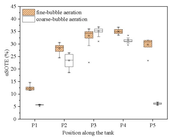 As shown in Figure 5, the αSOTE of coarse-bubble aeration systems and fine-bubble aeration systems were compared at a constant CFR. The αSOTE of the middle of the aeration systems was higher than that of the other two sides. For P2, P3, and P4, the αSOTE of coarse-bubble aeration systems was close to that of fine-bubble aeration systems. The highest αSOTE of fine-bubble aeration systems was 35% (P4), and the lowest αSOTE was 12.5% (P1). For coarse bubble aeration systems, the highest αSOTE and lowest αSOTE were 5.7% (P1) and 35.2% (P3), respectively. The most significant difference of the αSOTE between the fine-bubble aeration systems (29.7%) and the coarse-bubble aeration systems (6.2%) was at P5.