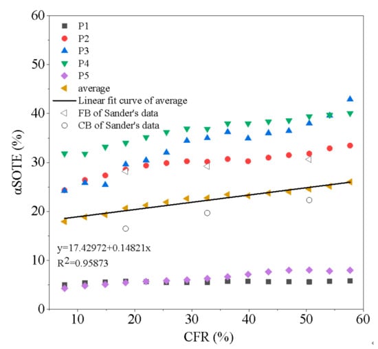 As shown in Figure 7, the αSOTE of all test points under different CFR were compared together, as well as Sander’s data (αSOTE of fine-bubble (FB) and αSOTE of coarse-bubble (CB)). We can conclude that the αSOTEs of aeration systems were improved by increasing the CFR. The αSOTEs of all the test points were ranked as P4 > P3 > P2 > P5 > P1, and the average αSOTE of the IFAS process ranged from 17.9% to 26.0%. Finally, the fitting function for predicting αSOTE was given as: αSOTE = 17.42972 + 0.14821·CFR (R2 = 0.95873).