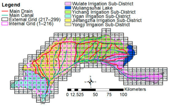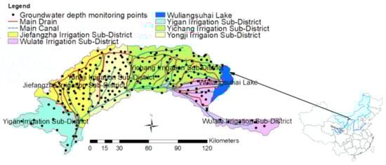 The HID is an important food production area, located in the western arid areas of the Inner Mongolia autonomous region of Northwest China (Figure 1). The study area has a typically arid and semi-arid continental climate, and the mean annual rainfall and annual pan evapotranspiration are approximately 130–210 mm and 2100–2300 mm, respectively [7,28]. The ground elevation ranges 1007–1050 m, covering a total area of 1.12 × 106 ha with 5.7 × 105 ha under irrigation, of which 5.25 × 105 ha are cropland [2]. The irrigation water mainly comes from the Yellow River, which has an average salt concentration of approximately 0.85 dS/m. The water flows into the district through general irrigation canals that run southwest to northwest alongside the river [29]. The main soil textures in the study area are silt sand, sandy loam, and loam. The crop-growing season is from April to October, and spring wheat, spring maize, and sunflowers are the main crops in the HID.