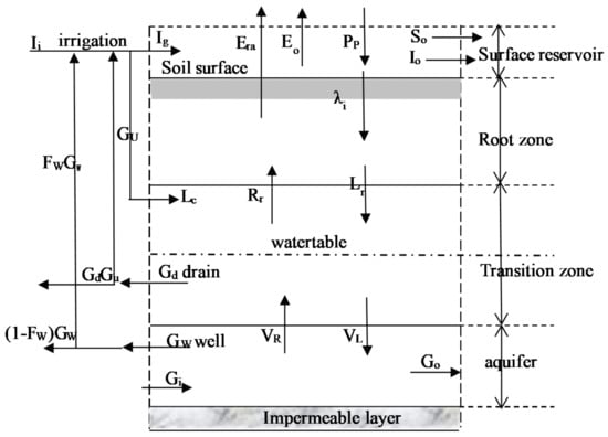 The SAHYSMOD model permits division of the study area into a maximum of 240 internal and 120 external polygons with a minimum of 3 and a maximum of 6 sides each. The spatial variations in cropping, drainage, and groundwater of the study area are defined by a nodal network of rectangular polygonal configurations, the centroid of each polygon is taken as the representative of the whole unit grid, and each grid is treated as a separate soil unit. According to the climate conditions, crop growth, irrigation, or fallow period, a year can be divided into 1–4 simulation seasons, and the length of each season can be determined according to its continuous month. In the vertical direction, the soil profile is divided into four layers: Surface reservoir, root zone, transition zone, and aquifer (Figure 2). Each layer has a water and salt balance equation, which is based on the water balance equation of each layer and its salt content. Groundwater flow is determined based on the finite difference method.