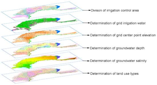 Figure 3 illustrates the input data extraction map of the grid center points in the study area. Groundwater was abstracted mainly through a number of shallow tube wells. The temporal dynamics of the groundwater table were monitored through a network of 248 observation wells distributed in the study area, and the monitoring frequency was once per 5 days. Among the 248 groundwater observation wells in the irrigation district, 91 wells synchronously monitored the groundwater salinity at a 50-day frequency. The irrigation amount per unit area was obtained by dividing the total water diversion volume of the final channel in the control area by the irrigation area of the control area, and the water diversion data of the channel were the monitoring values of the irrigation district administration. Canal water quality had an EC of 0.85 dS m−1. The surface elevation and land-use data were obtained using a DEM elevation map and interpretation of remote sensing data. ArcGIS built-in tools were used to obtain average input values of groundwater level, rainfall, and salt content in the center of each polygon.