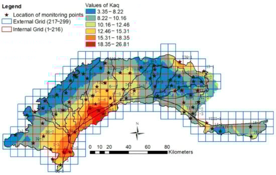 In this study, the spatial variation of aquifer properties was considered, and the spatial interpolation method was used to determine Kaq. According to the evenly distributed borehole data in the study area, the hydrogeological parameter Kaq determined by the pumping test was taken as the basic data, and the ordinary kriging method was used for spatial interpolation. Then, the Kaq value of each grid center point was extracted based on the GIS data extraction function. Figure 5 shows the Kaq spatial interpolation results in the study area. Kaq decreases from south to north in the HID and varies 3–13 m/day.