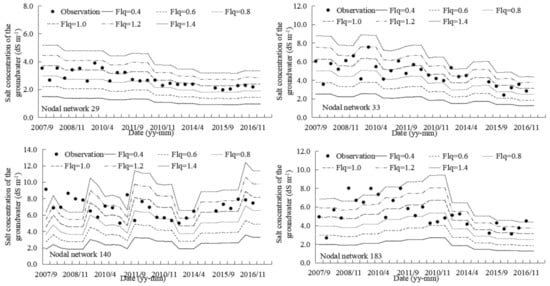 The leaching efficiency of the aquifer (Flq) is defined as the ratio of the salt concentration of the water outflowing from the aquifer to the average concentration of the water in the aquifer when saturated, and the values range from 0.01 to 2.0 in the SAHYSMOD model, firstly, simulating the groundwater salt concentration based on the arbitrary values of 0.4, 0.6, 0.8, 1.0, 1.2, and 1.4 for aquifer zones. Then, the simulated values of the groundwater salt concentration were compared with the measured values (Figure 6). Finally, the value of Flq was determined according to the best-matched measured values of Flq.
