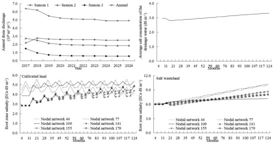 Figure 7 shows the changes in drainage quantity and drainage water salinity, and the soil salinity dynamics of the cultivated land and salt wasteland under current water management conditions based on the calibrated and validated SAHYSMOD model. As can be seen, the annual drainage volume of the total irrigation area first decreased and then gradually stabilized over the next 10 years, with average annual drainage of 531 million m3·yr–1. However, the salt concentration of the drainage water increased only slightly.