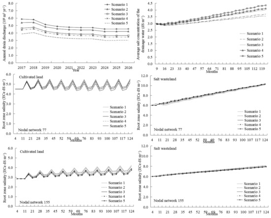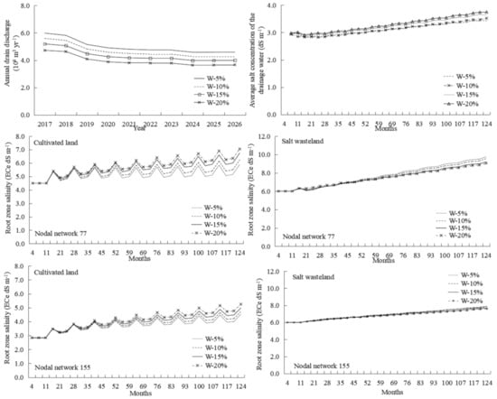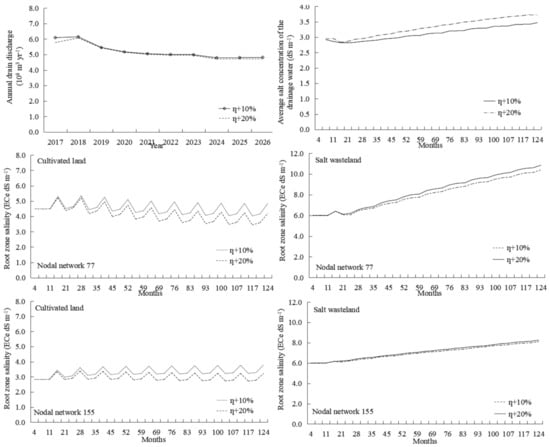 In this scenario, all other parameters were kept constant and different water efficiency of the canal system was set. When the total water diversion from the canal head was fixed, improving the water efficiency of the canal system reduced the leakage of the channel and the amount of groundwater supplied through the channel, while the irrigation water quantity of the last stage channel entering the field increased. Thus, the annual drainage and groundwater depth are affected by the leakage of the canal system and field. Figure 9 shows that the annual drainage volume first decreased and then gradually stabilized with the passage of time. In the early stage of the simulation, the drainage decreased greatly, while it gradually became stable in the later stage. This indicates that the leakage of the canal system has a great influence on the drainage volume of the irrigation area, while the influence of the drainage amount of the irrigation area from an increasing water efficiency of the canal system decreased when η was improved to a certain extent. This is mainly due to the gradual stabilization of the groundwater depth with the passage of time. The drainage water salinity increased with the improvement of η because the high η resulted in a small leakage from the irrigation canals and large irrigation water quantities entering the field. A larger autumn irrigation leaching salt will lead to a higher drainage water salinity. Simultaneously, the root zone salinity of the cultivated land significantly fluctuated seasonally and decreased with the improvement of η in the same period due to the larger autumn irrigation leaching salt. Thus, the water efficiency of the canal system has a great influence on controlling the root zone salinity of the cultivated land. After the end of the simulation period, taking grid 77 as an example, when the η = 10%, the soil salinity of cultivated land increased by 7.8%, the annual drainage water salinity increased by 11.1%, and the annual salt discharge was 95.15 t·yr–1; When η = 20%, the soil salinity of cultivated land decreased by 6.5%, the annual drainage salinity increased by 17.1%, and the annual salt discharge was 99.49 t·yr–1. From the point of view of salt discharge in the irrigation area and soil salt control in cultivated land, the scenario of η = 20% is the best.
