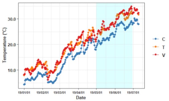 Figure 1. Temperature trend for all the treatments during the experiment (indicated by blue shading). C, ambient temperature; T, +4 °C constant warming; V, variable warming.