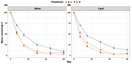 Figure 2. Mass remaining of Stem (A) and Leaf (B) over 60 days in C, T and V treatments. C, ambient temperature; T, +4 °C constant warming; V, variable warming. All data are presented as mean ± se.