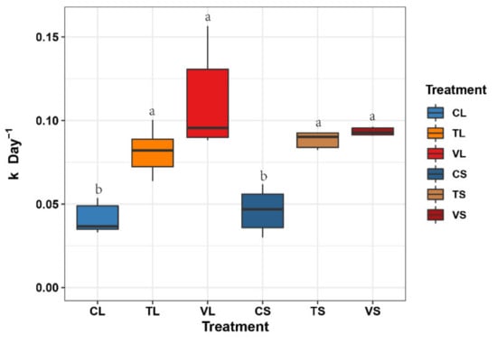 Figure 3. Comparison of litter decomposition rate (k, Day−1) in Stem and Leaf among different temperature treatments. Treatments with different lowercase letters indicate significant (p < 0.05) differences between treatments. C, ambient temperature; T, +4 °C constant warming; V, variable warming; L, leaf litter; S, stem litter. All data are presented as mean ± se. Significant (p < 0.05) differences among treatments are indicated by letters above the bars.