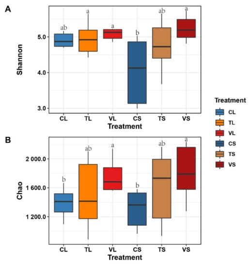 Figure 4. Differences of bacteria diversity among treatments in different seasons. (A) Shannon index of stem bacteria; (B) Chao index of stem bacteria; C, ambient temperature; T, +4 °C constant warming; V, variable warming; L, leaf; S, stem All data are presented as mean ± se. Significant (p < 0.05) differences among treatments are indicated by letters above the bars.