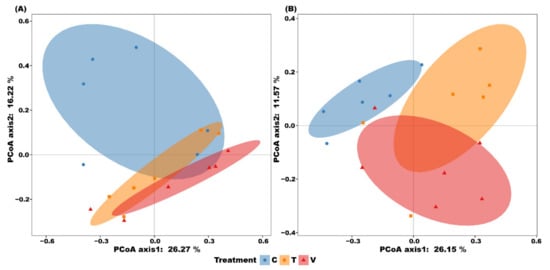 Figure 5. PCoA plots derived from the Bray-Curtis dissimilarities of bacterial community composition for Stem (A) and Leaf (B) litter. C, ambient temperature; T, +4 °C constant warming; V, variable warming.