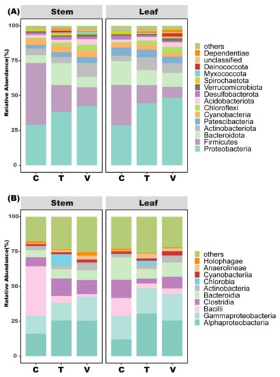 Figure 6. The relative abundance of the phylum (A) and class (B) taxa of bacteria associated with stem and leaf litter decomposition. The presented relative abundances are based on the 97% similarity clusters of the OTUs. C, ambient temperature; T, +4 °C constant warming; V, variable warming.