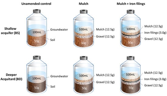 Three different treatment conditions were established, depending on the applied electron donor (Figure 1). The “unamended control” did not receive any exogenous electron donor, in addition to what was already present in the groundwater and in the soil. The “Mulch” treatment contained 12.5 g of finely shredded pine and spruce mulch and 12.5 g of washed river gravel (2–6 mm); the “Mulch + Iron filings” treatment differed from the “Mulch” treatment for the additional presence of 3 g of iron filings as a reducing agent.