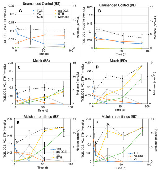 Time course of TCE and cis-DCE dechlorination in BS and BD microcosms, under different electron donor conditions (mean values ± standard error of duplicate microcosms): (A,B) no electron donors; (C,D) Shredded pine and spruce mulch; (E,F): Shredded pine and spruce mulch and iron filings.