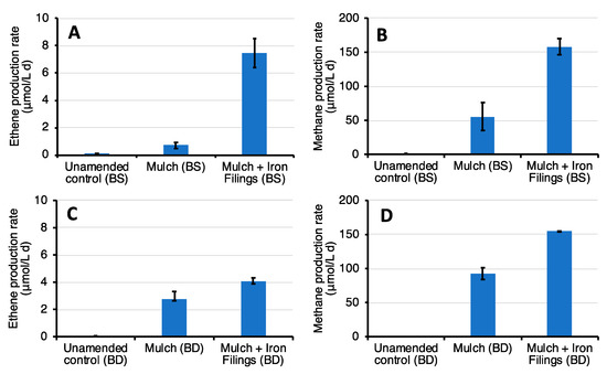 Interestingly, in the BS microcosm, the rate of ethene formation in the presence of mulch and iron filings was more than 10 times higher than in the corresponding microcosm lacking the iron filings. The enhancement effect was apparently lower (nearly 1.4-fold) in the BD microcosms. It is worth noting that the iron filings also had a marked effect on the kinetics of methane production, which was enhanced by a factor of 2.5 in BS microcosms and 1.7 in BD microcosms.