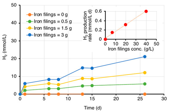 To prove this case and quantify the capability of the used iron filings to generate H2 via abiotic iron oxidation (i.e., corrosion), additional batch experiments were conducted, using increasing amounts of iron filings (up to 3 g) which were added to serum bottles (120 mL) containing anaerobic mineral medium (pH = 7). Production of H2 commenced from the beginning of the tests and continued at a constant rate for the whole duration of the experiment (26 days) (Figure 3). Notably, the rate of hydrogen production was linearly dependent on the applied iron filings concentration (inset of Figure 4).