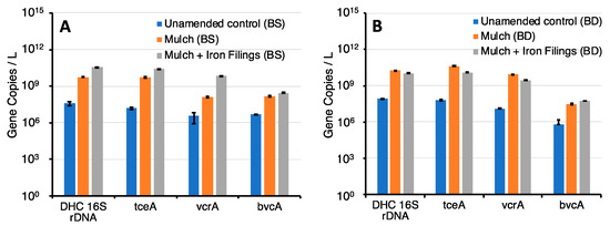The stimulatory effect of mulch and mulch and iron filings on the reductive dechlorination process was confirmed by the results of the biomolecular analyses. Indeed, in all amended microcosms, at the end of the incubation period the abundance of D. mccartyi and related rdhA genes was more than two orders of magnitude higher than in the unamended controls (Figure 5). As confirmed by the chemical analyses, the effect of iron filings was more evident in microcosms BS (Figure 5A) in which the concentration of D. mccartyi and related dehalogenases was higher (p < 0.005) in “Mulch + Iron Filings” microcosms than in “Mulch” microcosms. By contrast, in BD microcosms in which the apparent effect of the iron filings on the kinetics of the dechlorination process was less marked, no statistically relevant differences were noticed in the concentration of D. mccartyi and related rdhA genes among “Mulch” and “Mulch + Iron Filings” treatments (Figure 5B). Overall, the observed correlation between VC dechlorination and biomolecular parameters in the different microcosms provides an additional line of evidence that iron filings enhanced the RD process by stimulating the microbial activity (through H2 evolution) rather than by catalyzing the direct abiotic dechlorination of contaminants.