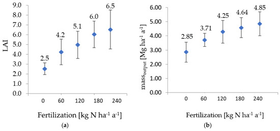 The mean LAI values of each fertilization treatment varied between 2.5 and 6.5 (Figure 1a). Mean seed yield of each fertilization level was between 2.85 and 4.85 Mg ha−1 a−1 (Figure 1b). Seed yield and LAI increased with higher fertilization treatments. However, for N fertilization, the analyses of the differences of the mean showed that on amounts higher than 120 kg N ha−1 a−1, the LAI and yield increases were not significant from those at a fertilization treatment of 120 kg N ha−1 a−1 (Table 3).