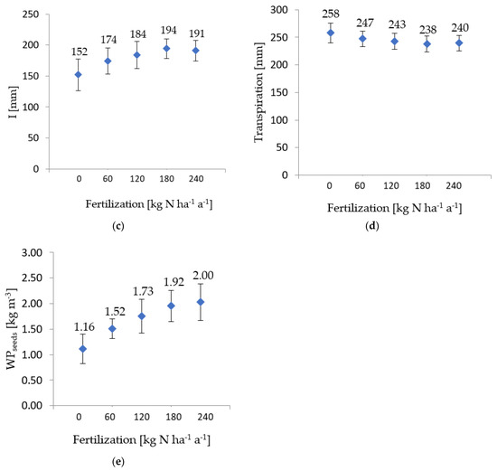 WPseeds values found in this study for the unfertilized control sample (N0) are within the range of 0.4–1.8 kg m−3 reported from 42 different case studies simulated by [43] for southern New South Wales (Australia). WPseeds increased with increasing N fertilization amounts, which is in line with the findings of [38]. Furthermore, WPseeds increased with an increased yield of seeds, LAI, and modeled evaporation from interception. WPseeds showed a slight tendency to decrease with increased modeled transpiration. A tendency of a decreased transpiration with increasing yield was found in the presented study. More water seems to be intercepted and evaporated from the plant surfaces. With higher N fertilization amounts, transpiration decreases considerably less than interception increases in this study. Increasing fertilization treatments resulted in gradual and clear increase from 45% to 67% interception of precipitation [24]. Hence, less soil water was available with increasing amounts of fertilization since the water fraction evaporating from the canopy increases. The yields in the study of [43] showed a different effect: Yield increased with increasing transpiration and a high proportion of 82% of the variance in seed yield could be explained with the water supply predictor for modeled values of 42 different data sets. The main factors determining evaporation from interception appeared to be LAI, plant architecture, and meteorological conditions during the crop cycle [24].