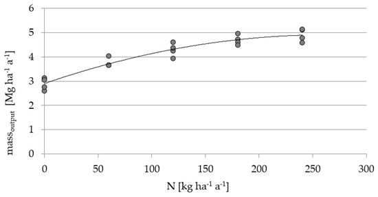 The yield increased with an increasing nitrogen fertilization rate (Figure 2). The maximum economic return to N fertilizer (MERN) based on the average yield response to N was found at 215 kg mineral N ha−1 a−1 (between 176 and 316 kg mineral N ha−1 a−1 for the respective years).