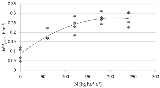 Furthermore, maximal WPprofit was calculated based on the crop yield response function, costs for N, and water input (Equation (2)) and indicated as optimum N fertilizer levels with respect to monetary-based water productivity WPprofit. There are no costs for the water input in this study since it is a rainfed winter oilseed rape cultivation.
