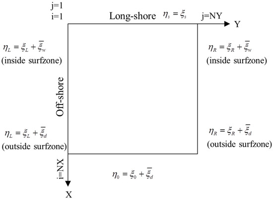The left boundary of the velocity is shown in Equation (30), the right boundary is shown in Equation (31), the offshore boundary is shown in Equation (32), and the longshore boundary is shown in Equation (33).