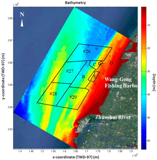 The numerical process is to first calculate the distribution of the wave pattern, and then use the radiation stress and the change mechanism of the tide level to analyze the mixed current pattern including near-shore currents. According to the principle of zoning for offshore wind farms in Taiwan, 36 potential areas (different colors) can be planned from north to south, as shown in Figure 2 [29]. It can be seen from Figure 2 that most of the potential areas are concentrated in western Taiwan. Since most offshore wind turbines are set up at a depth of 30 m along the coast, and the offshore wind farm will form a certain area of obstacles, this may affect fishing operations and will have a direct impact on the livelihood of fishermen. Therefore, this study will establish numerical topography for the area closer to the shore. The water depth data needed to establish the numerical topography mainly collect the water depth as measured by the 4th River Management Office (Water Resources Agency) and the large-scale water depth data provided by Ocean Data Bank (Ministry of Science and Technology). This study will establish numerical topography for the area closer to the shore. The grid size for the wave field simulation must meet the 1/8 wavelength, but most developers of offshore wind power generation in Taiwan currently propose to use the jacket-type offshore wind turbine support structure, such as that shown in Figure 3 [30]. As the diameter of the structure using the jacket-type is not large, considering the calculation efficiency and error, the spatial grid sizes of were used in wave and hydrodynamic model, and the time step interval of was used for the model. The calculation conditions of the numerical model were mainly obtained by the observation station and referring to the field observation data of The Feasibility Study of Offshore Wind Power in Changhua: Phase One [31]. Table 1 lists the configuration settings of the hydrodynamic model. Additionally, the numerical topography created from these data are shown in Figure 4, and the water depth distribution was between −10 and −50 m. Figure 5 compares the model simulation results with the current measurement. The calculated current velocity, current direction, and changes in water level were all highly consistent with the measured data. The currents simulated by the model generally flowed parallel to the coastline. Specifically, the current flowed from the southwest to the northeast during flood tides and from the northeast to the southwest during ebb tides. The results, in accordance with the actual situation, indicate that the model successfully reproduced the characteristics of the currents in the sea area. After the boundary conditions and related parameters adopted by the hydrodynamic model were determined, the model was employed to calculate the hydrodynamic characteristics before and after the offshore wind turbine was established.