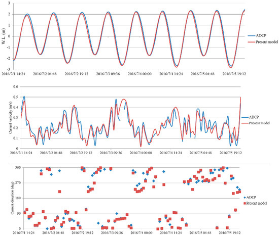 In this study, the tidal effect was added to the hydrodynamic model. In addition to the tide, which is regarded as a long wave, the Coriolis force effect of the earth’s rotation was also considered. The governing equations of the hydrodynamic model are as follows: