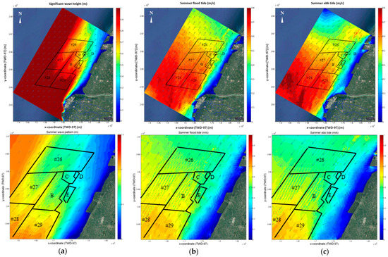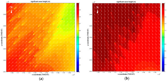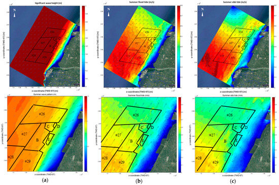 This study referred to the technical content of The Feasibility Study of Offshore Wind Power in Changhua: Phase One [31] to set the mode input conditions. In summer, the wave height was 1.2 m, the period was 6.5 s, and the wave direction was south-southwest (SSW); in winter, the wave height was 3.0 m, the period was 7.5 s, and the wave direction was north–northwest (NNW). In order to make the results clearer and more convenient, this study will narrow down the calculation results. The simulation results of the summer and winter wave and current patterns are shown in Figure 6a and Figure 7a. The summer monsoon wave was attenuated sharply at a depth of about 0–2 m near the shore, which means that most of the wave energy was released in this area; the winter monsoon wave was also attenuated sharply at a water depth of 0–2 m. The diagrams of the near-shore current simulated by Figure 6b,c and Figure 7b,c show that the phenomenon of near-shore currents generated by waves before and after breaking waves was quite obvious. During the wave impact of the summer monsoon, the direction of the current between a 0 and 2 m water depth was approximately from the southwest to the northeast, and a vortex also occurred in some areas between a −1 and −3 m water depth nearing the protruding coastal structures. Additionally, during the winter monsoon, a large near-shore current velocity was found between the depth of −1 and −5 m, and the overall transmission direction was roughly southwest–northeast. The average velocity of the overall offshore wind farm area was between 0.56 and 0.58 m/s, and the maximum velocity was between 0.78 and 0.88 m/s. The velocity under the effect of the winter monsoon wave was greater than that under the summer monsoon wave.