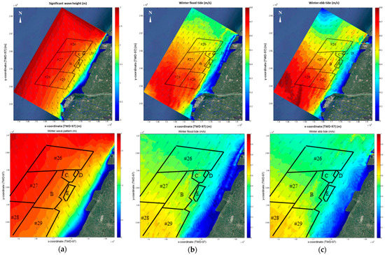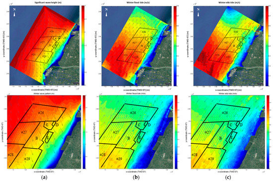 Simulation results of wave and current under winter conditions. (a) Wave height and direction distribution; (b) flood tide current pattern; (c) ebb tide current pattern.
