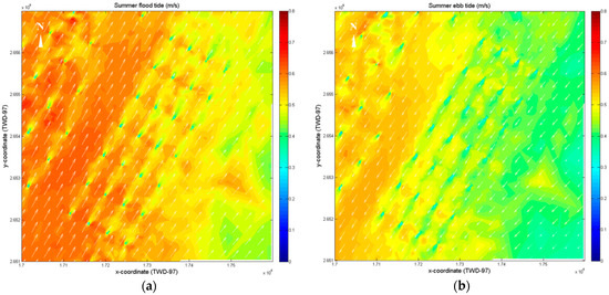 Simulation results of local current patterns in summer after wind turbines were established. (a) Flood tide current pattern; (b) ebb tide current pattern.