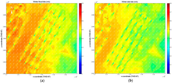 Simulation results of local current patterns in winter after wind turbines were established. (a) Flood tide current pattern; (b) ebb tide current pattern.