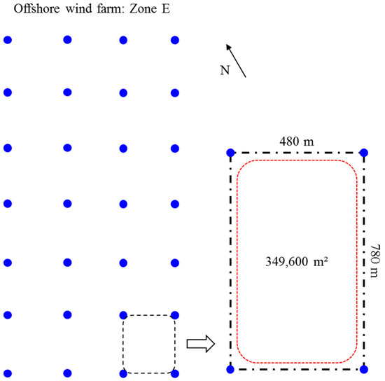 The analysis of the local simulation results after the offshore wind turbines were established shows that the underwater foundation of the wind turbine only affected the local area near the foundation structure. The overall simulation results show that the waves and currents caused by the wind turbine had a limited influence range, which is probably within the area of the foundation structure of about four to five times the size of its diameter (12–15 m). The influence of the wind turbines’ foundation structure on the current was also limited to an area of six times the size of the pile diameter (18 m). These results show that the range of waves and currents affected by the wind turbine occurred in local areas. In order to consider the combination of offshore wind power and traditional fisheries as a form of cooperative development, this study used the case of a circular cage culture that is more common in Taiwan’s seas and can effectively resist waves [33]. As shown in Figure 15, this study used the offshore wind field (code E) that is closer to the shore as an analysis case. The arrangement of the wind turbines in the offshore wind farm with code E was such that the parallel shoreline distance was 780 m and the vertical shoreline distance was 480 m. After deducting the range of possible influence of the waves and currents after passing the offshore wind turbine under the influence of monsoon conditions, the estimated range of 349,600 m2 not affected by the offshore wind turbine can be obtained. After referring to the research on the relevant offshore cage culture [34,35,36], this study took the circular cage culture with a diameter of 20 m as an example and configured it with the cage culture system of Figure 16. From the range of the outer anchoring system, a diameter of approximately 100 m can be obtained. If preparations are made in a regular arrangement, approximately 40 cage cultures can be placed in the area not affected by the wind turbines. If this is expanded to the entire offshore wind farm, it should be possible to configure 720 cage cultures. It is worth mentioning that the use of this configuration does not take into account the future operation of the entire offshore wind farm. If the operation and maintenance of offshore wind farms are not affected, and if the consent of the developer is obtained, it should be possible to use this method to provide economically large-scale farming areas and as a mutually beneficial method for offshore wind power generation and fishery.