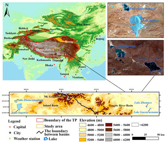 Because the lake dynamics could be associated with lake type, it is important to differentiate lake type when analyzing the lake change [23]. Here, we chose four non-glacier-fed lakes (Lake Yagenco, Lake Zhamcomaqiong, Lake Zhamuco, and Lake Gaeencuonama) in the 33° N zone of the central TP, and these lakes are located on the northern slope of the Tanggula Mountains. The first two lakes are located within the inland basin, and the last two lakes are located within the Yangtze River Basin [24]. These four lakes are in one of the 25 National Key Ecological Function Areas in China and are also in one of the key implementation areas of the ecological conservation and restoration project in the Three-River Source Region (TRSR) [25]. In this study, we investigated the patterns of the area changes of two endorheic lakes and two exorheic lakes at similar latitudes on the central TP, examined how climatic factors affect these patterns, and explored the differences of evolution patterns and driving mechanisms among these endorheic lakes and exorheic lakes. Following the Introduction, Section 2 introduces the study area, describes the materials used, and explains the methodology in detail. Section 3 presents the lake area dynamics and their influencing factors and analyzes the relationships between the lake area and climate factors. Section 4 presents a discussion of the changes in the TP’s lakes and the influencing factors. The conclusions and further implications are presented in Section 5. As a case study, this research provides an improved understanding of lake area changes among endorheic lakes and exorheic lakes and promotes a better understanding of the environmental changes caused by global warming on the TP.